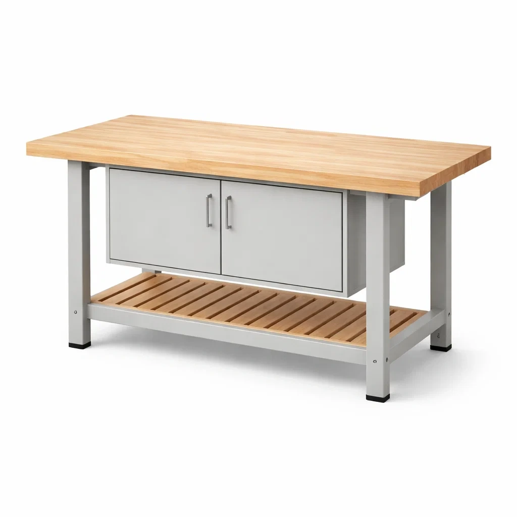 Banco da lavoro in legno e metallo con ripiano e armadietto grigio