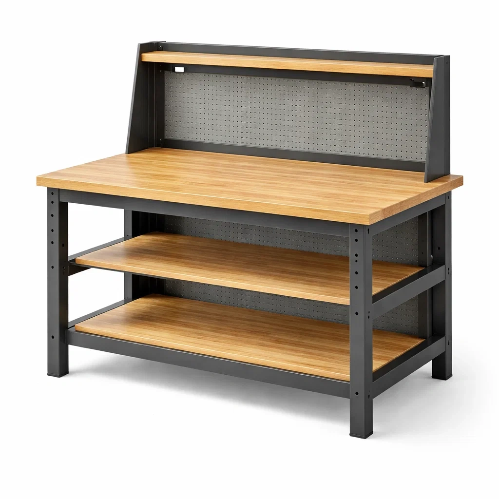 Banco da lavoro in metallo e legno con ripiani regolabili 120x60x150 cm
