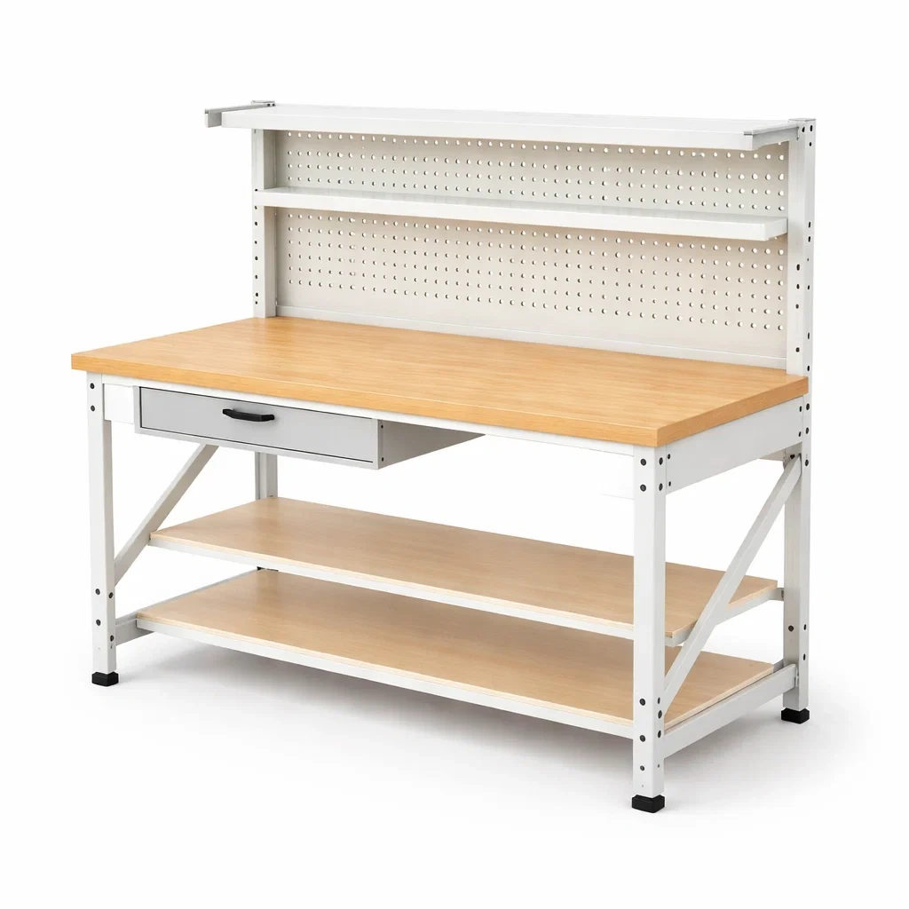 Banco da lavoro con piano in compensato e struttura in acciaio bianco