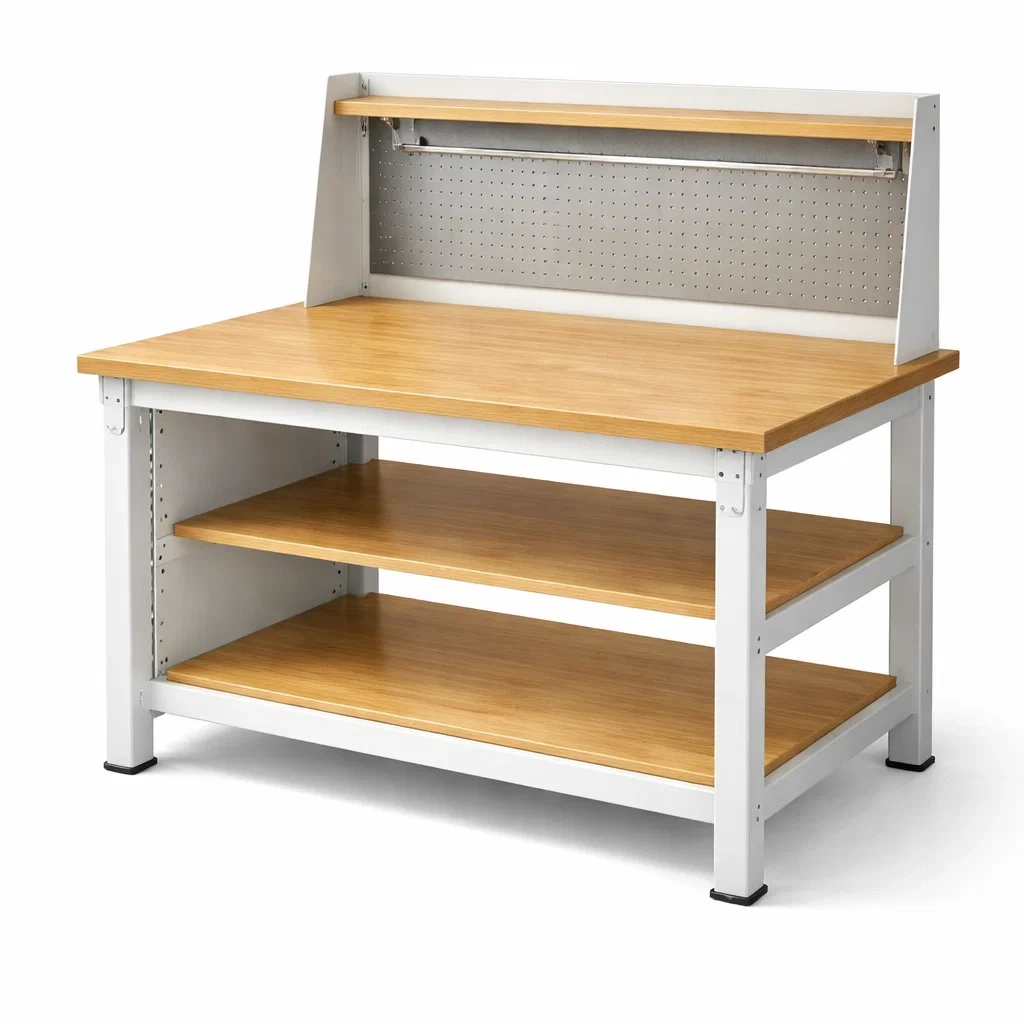 Banco da lavoro con struttura in acciaio e ripiani in legno compensato. Dimensioni: 150 cm di lunghezza, 75 cm di larghezza e 91 cm di altezza. Peso totale di 40 kg. Colore: Grigio e Legno naturale. Incluse 3 mensole. Carico massimo: 100 kg per mensola. Nota: Assemblaggio richiesto. Pulire con un panno umido senza utilizzare prodotti chimici aggressivi. Angoli rinforzati per maggiore stabilità.